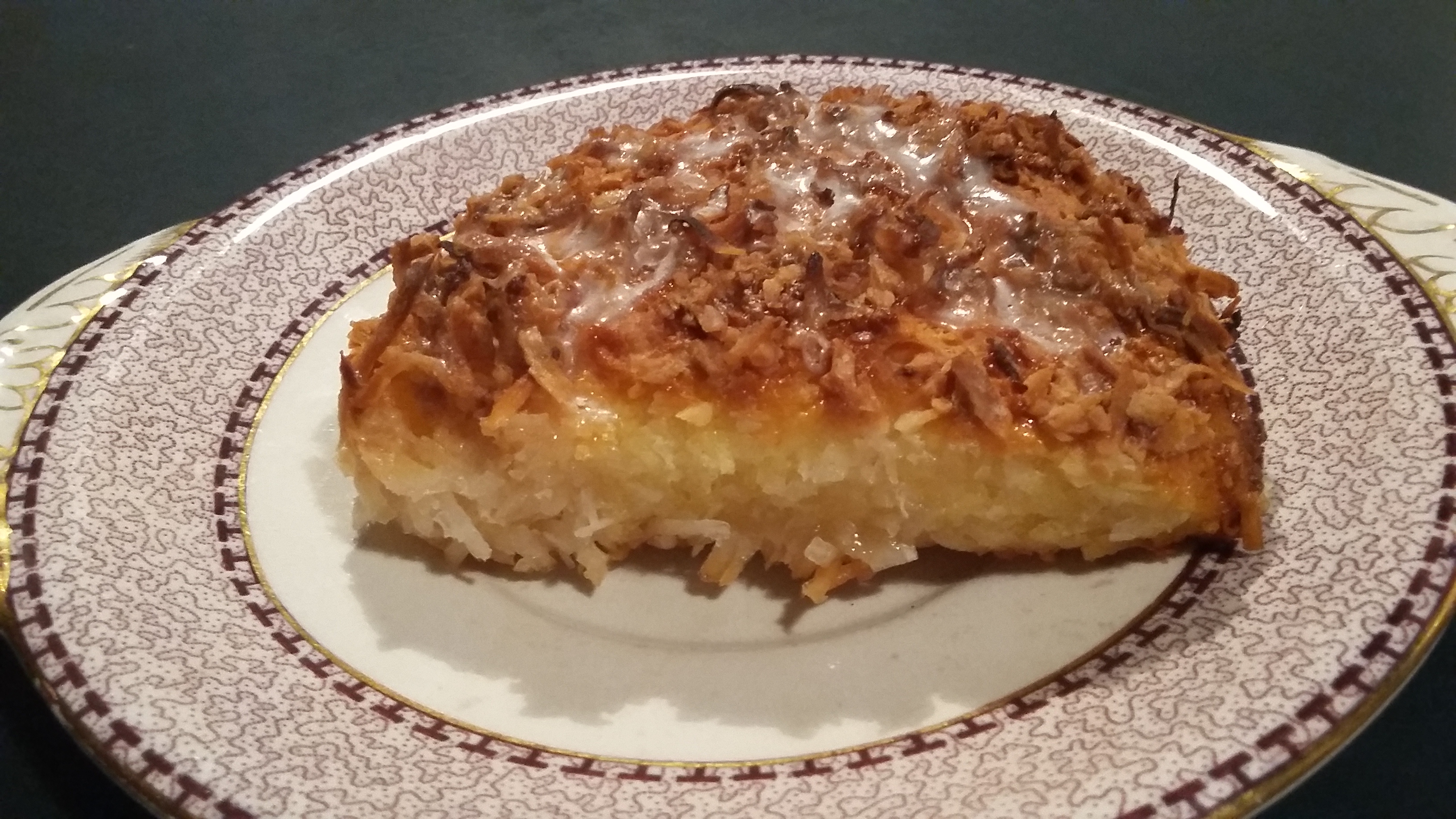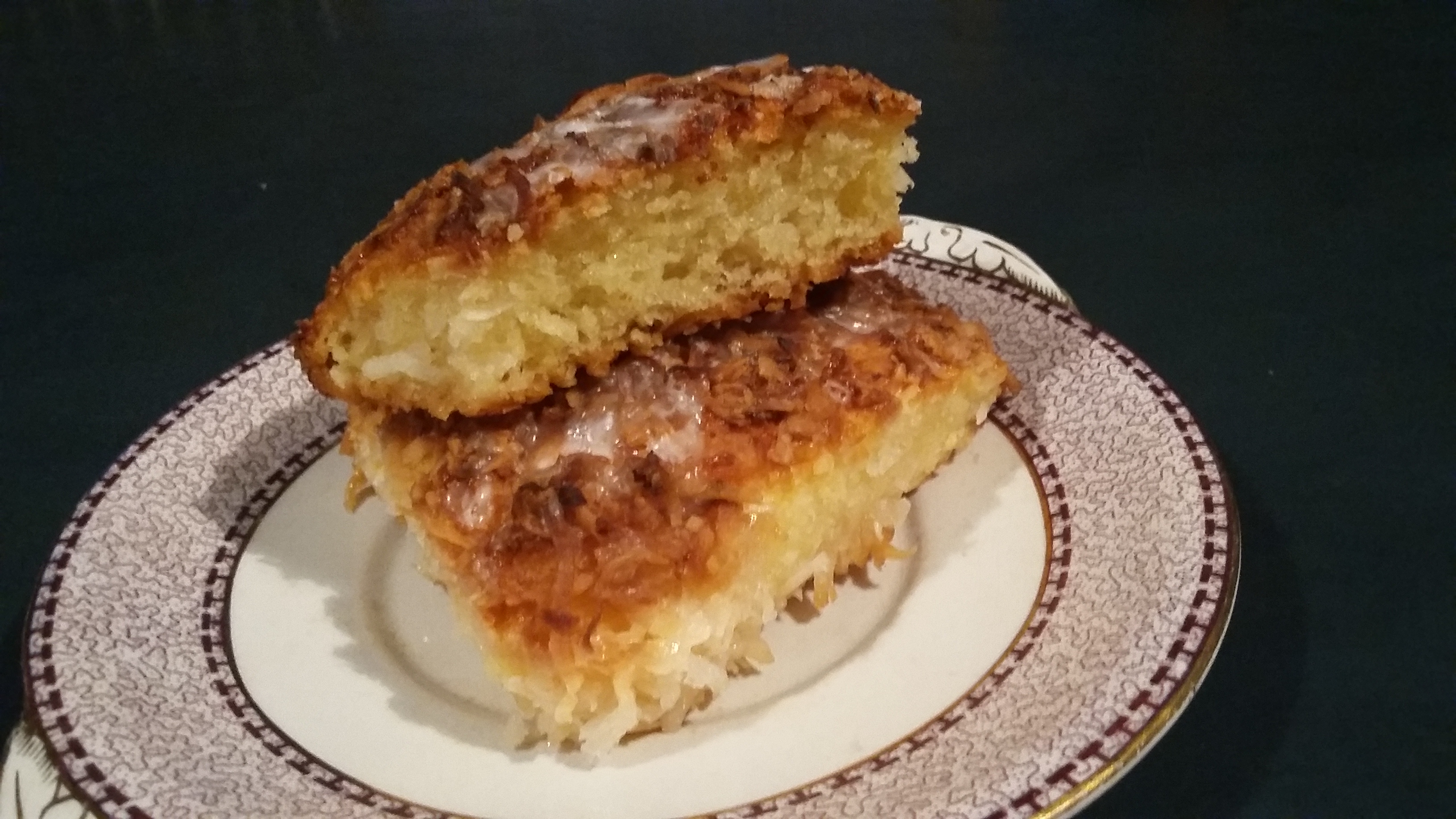 –Bake at 175° (350°F) for about 45 minutes. Knock the bottom- if it sounds hollow (like when baking bread) and the coconut on top is nice and brown, they’re done.